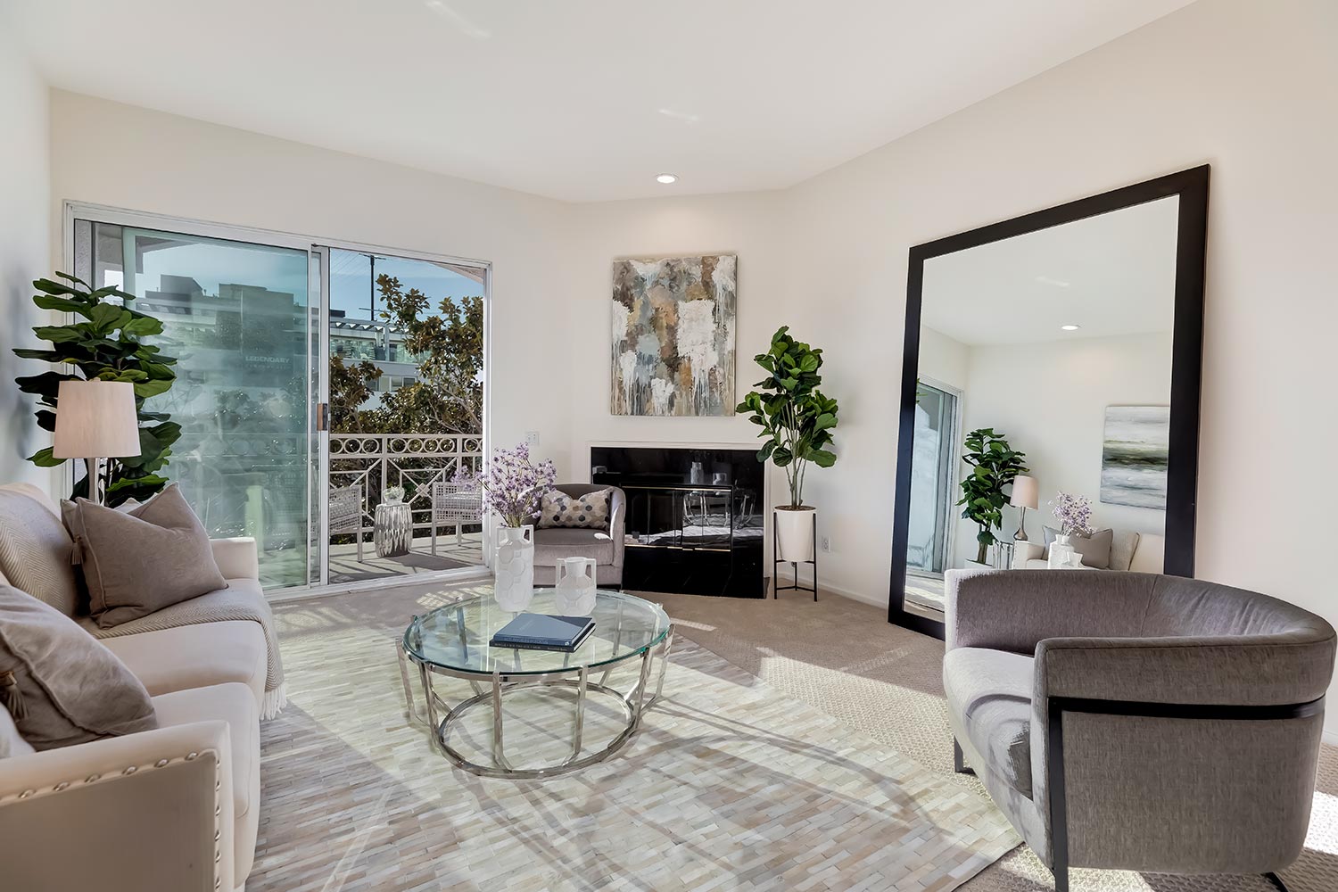 Welcome to this lovely light & bright unit that is perfectly located in Westwood/Century City. Natural light fills this open floorplan which features living room with fireplace, dining area and kitchen with updated appliances. Look out onto treetop views from both patios off the living room and main bedroom. The main bedroom has an ensuite bathroom, walk-in closet, balcony and enough room for a home office. Features include, recessed lighting, newer carpet and paint, updated kitchen appliances, and newer air conditioning unit. This 23 unit building offers controlled access, elevator, gated community garage parking with 2 tandem parking spots and guest parking.